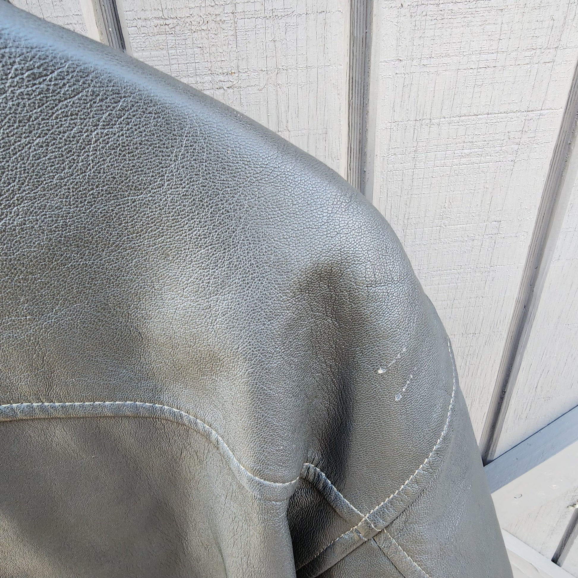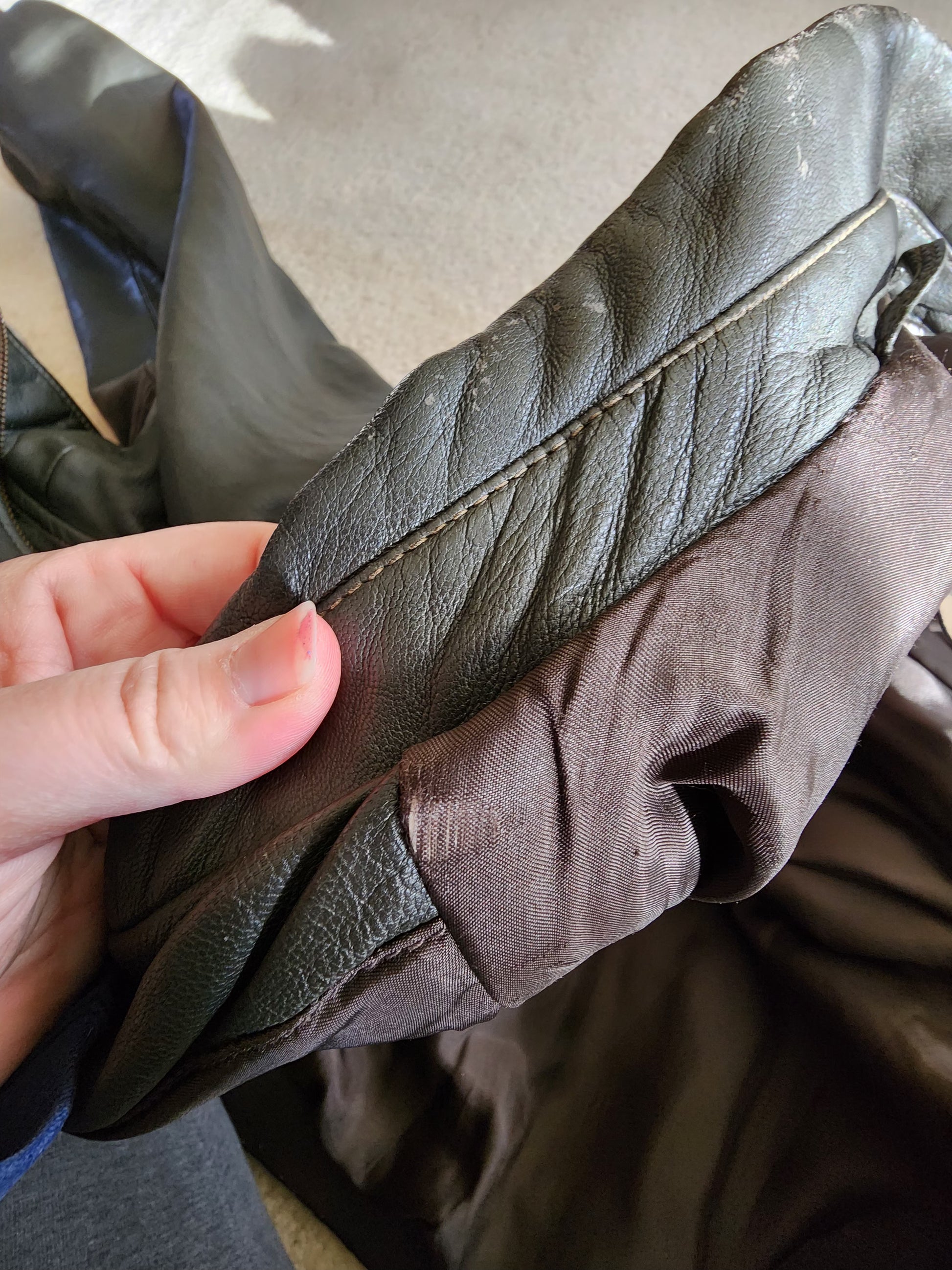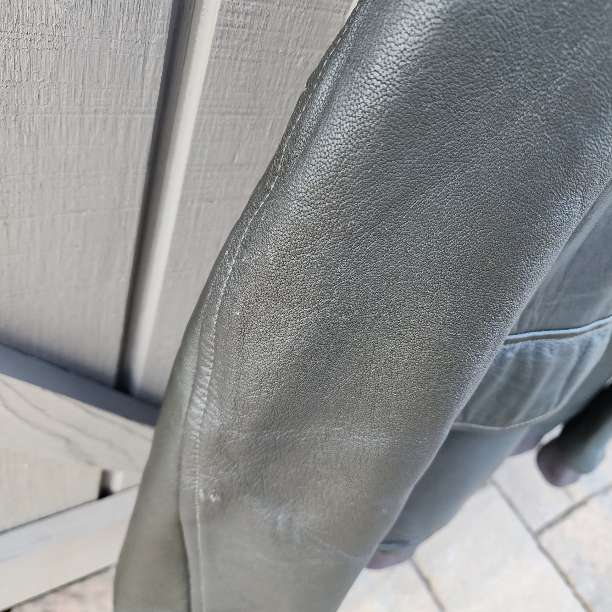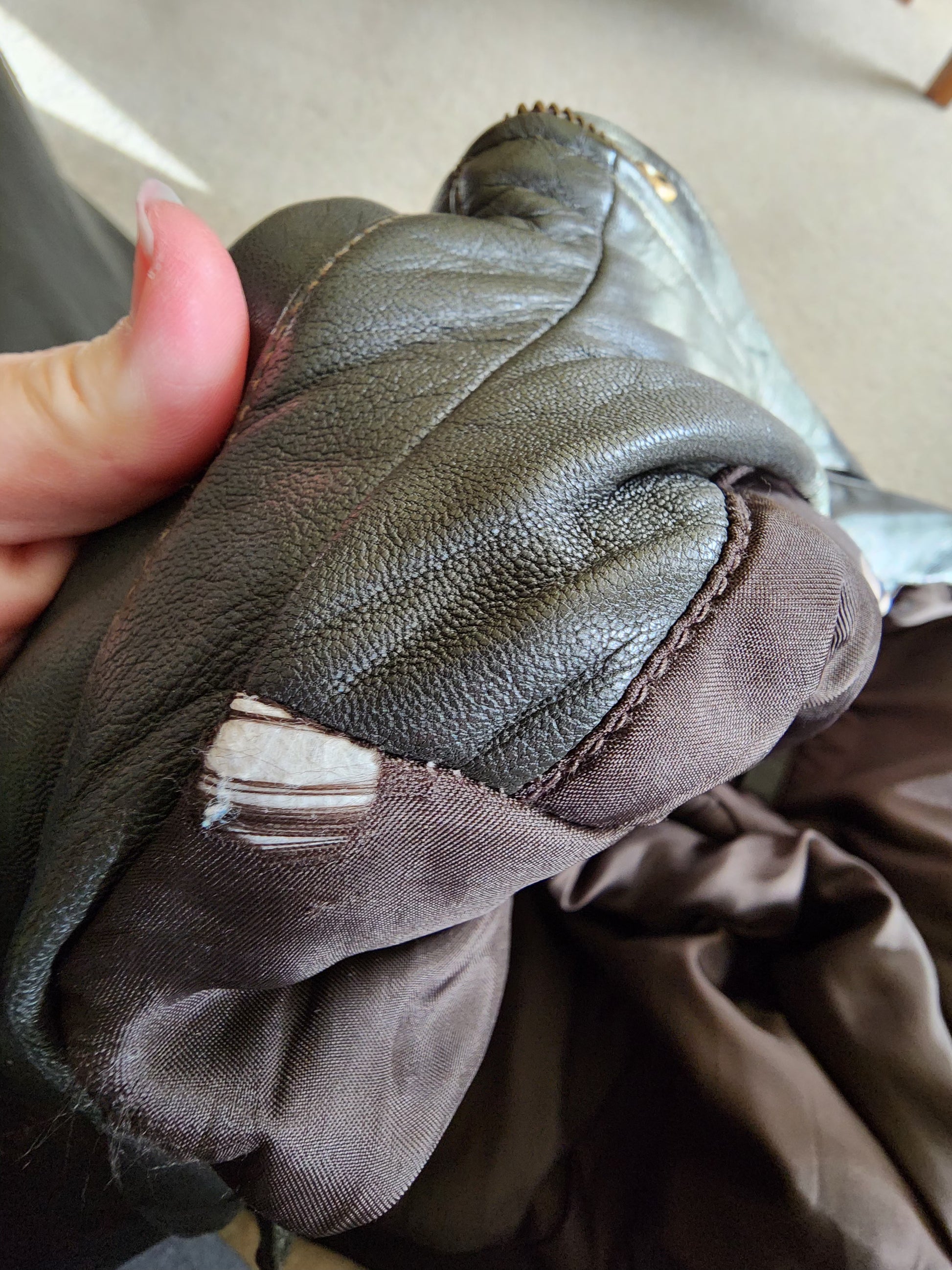 Please see pictures showing scuffs, scratches, buffs, inner wear (few tears in fabric) and outer wear. There are flaws, but it's vintage leather, so this is a common occurrence. There are pills on sleeve cuffs and the band across the bottom. Please observe flaws carefully.