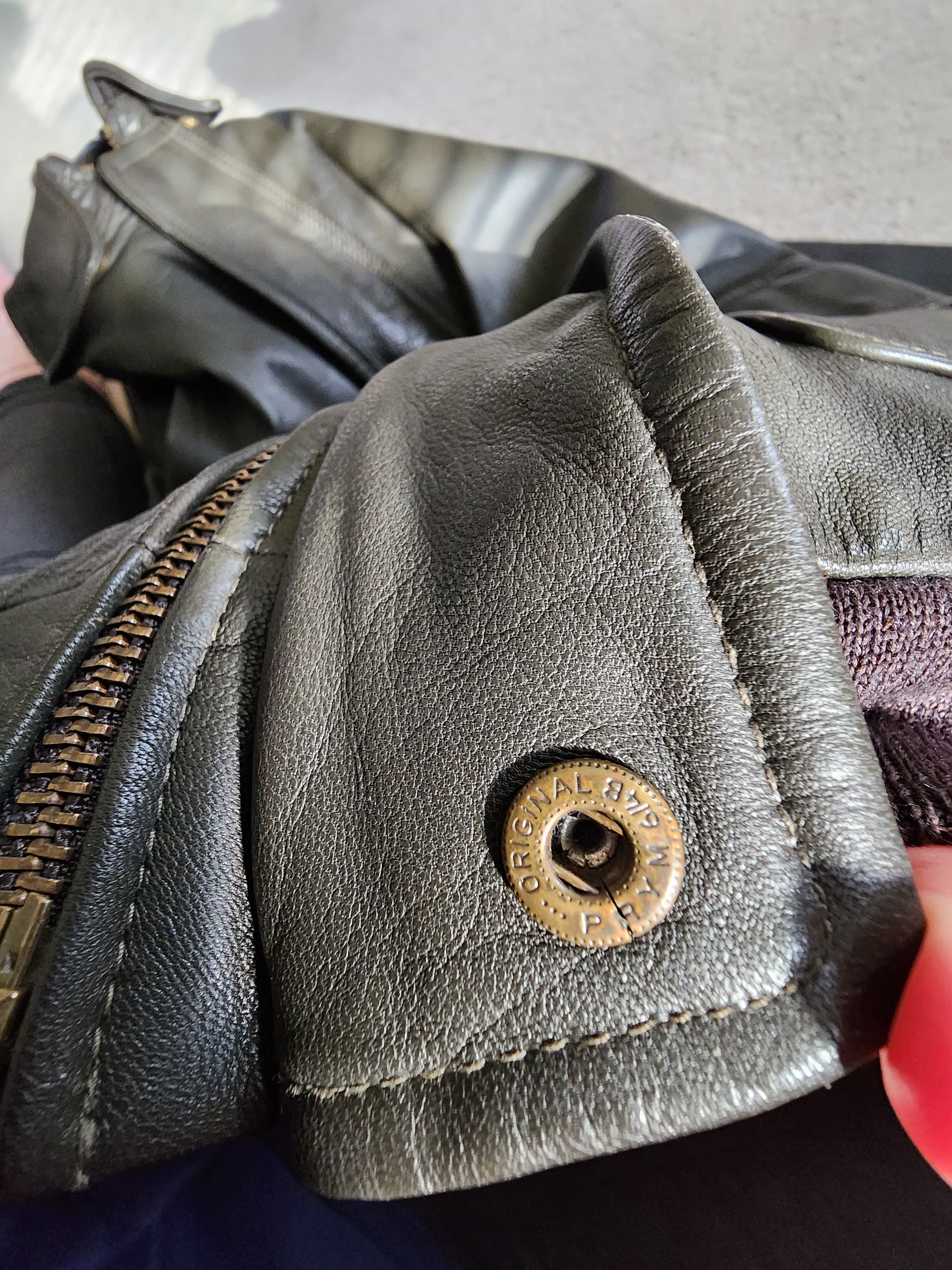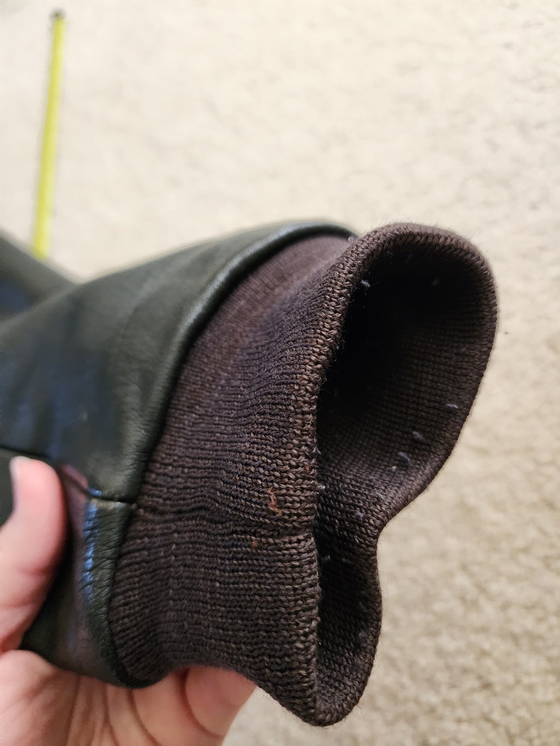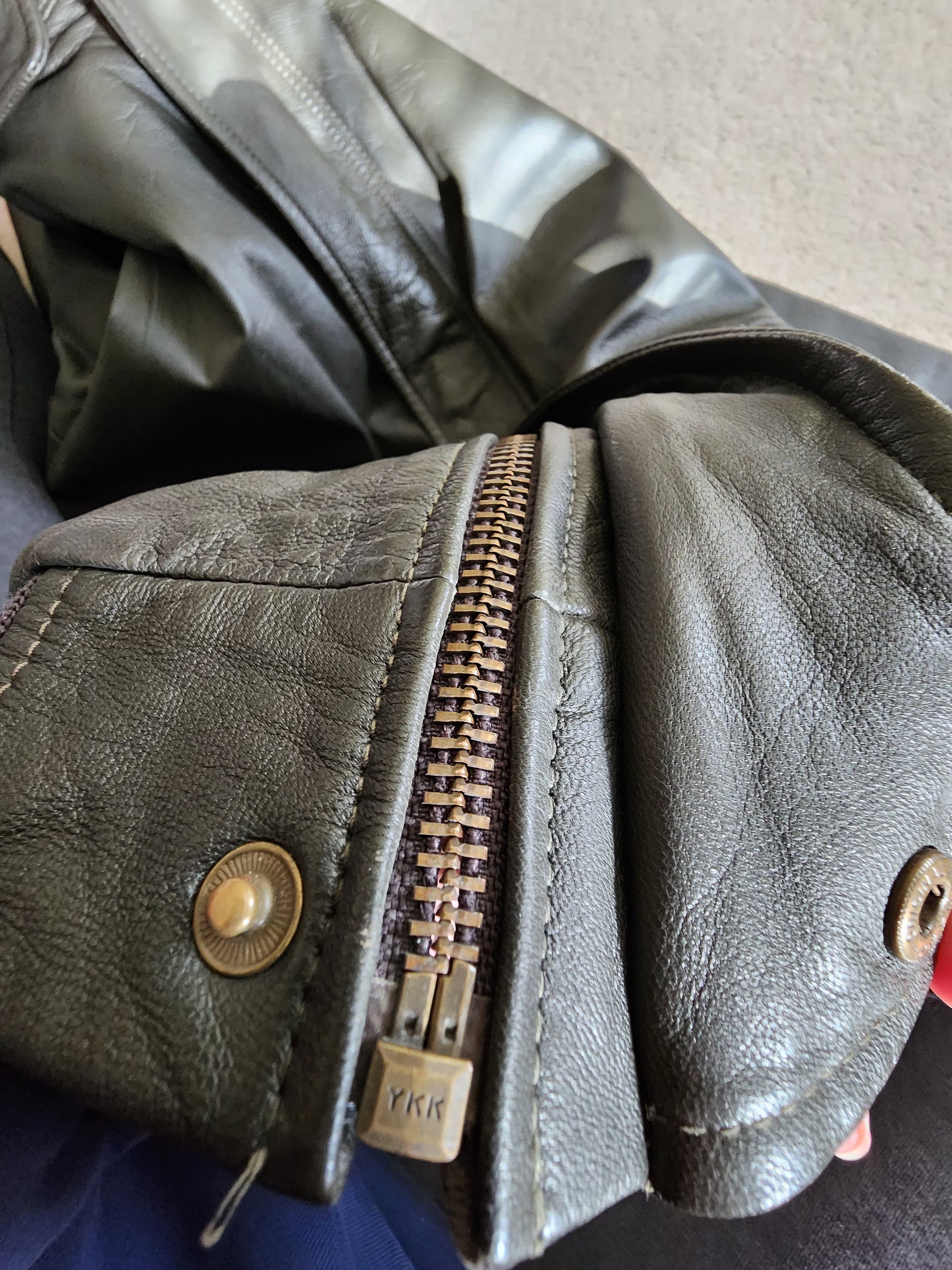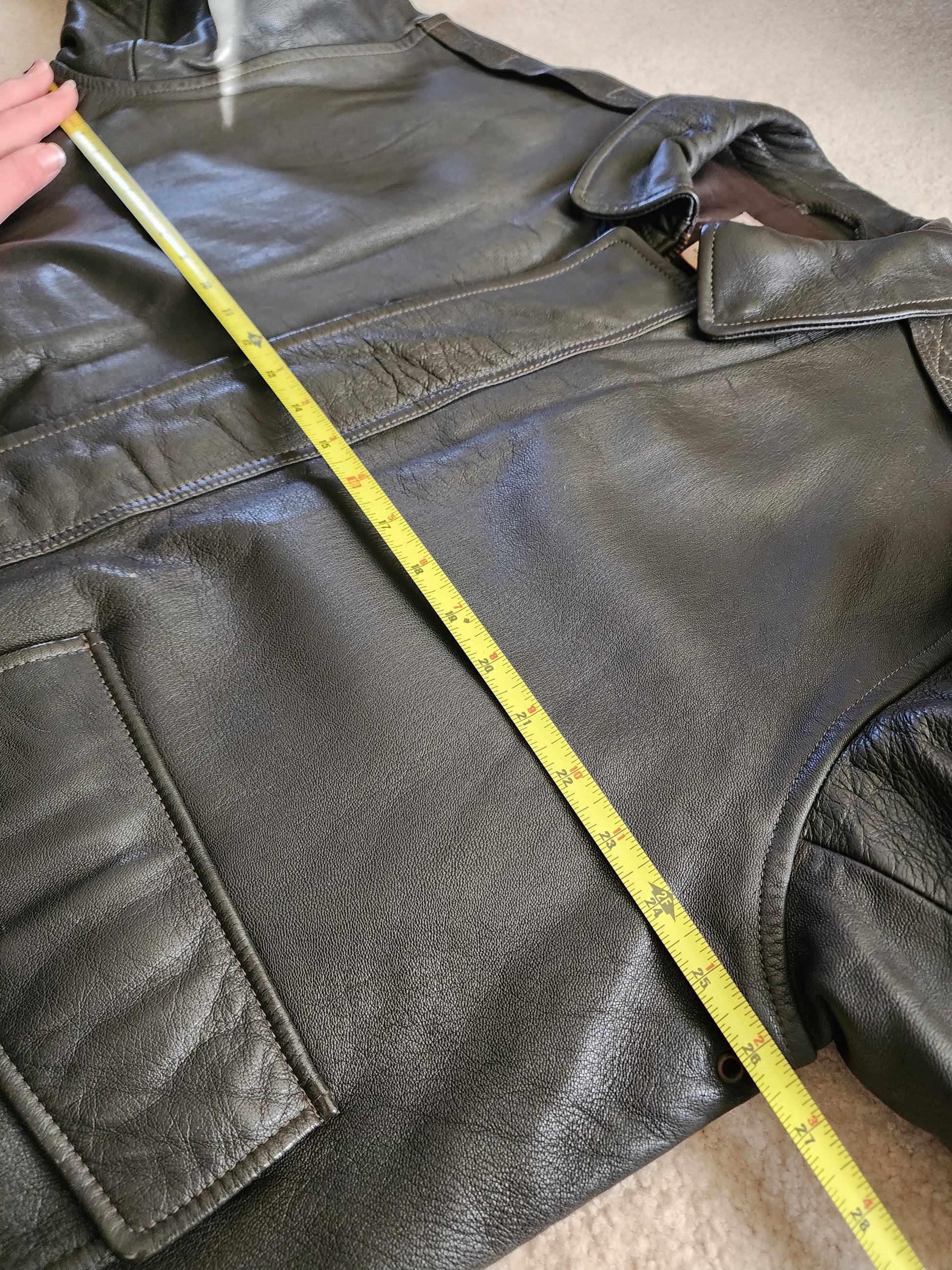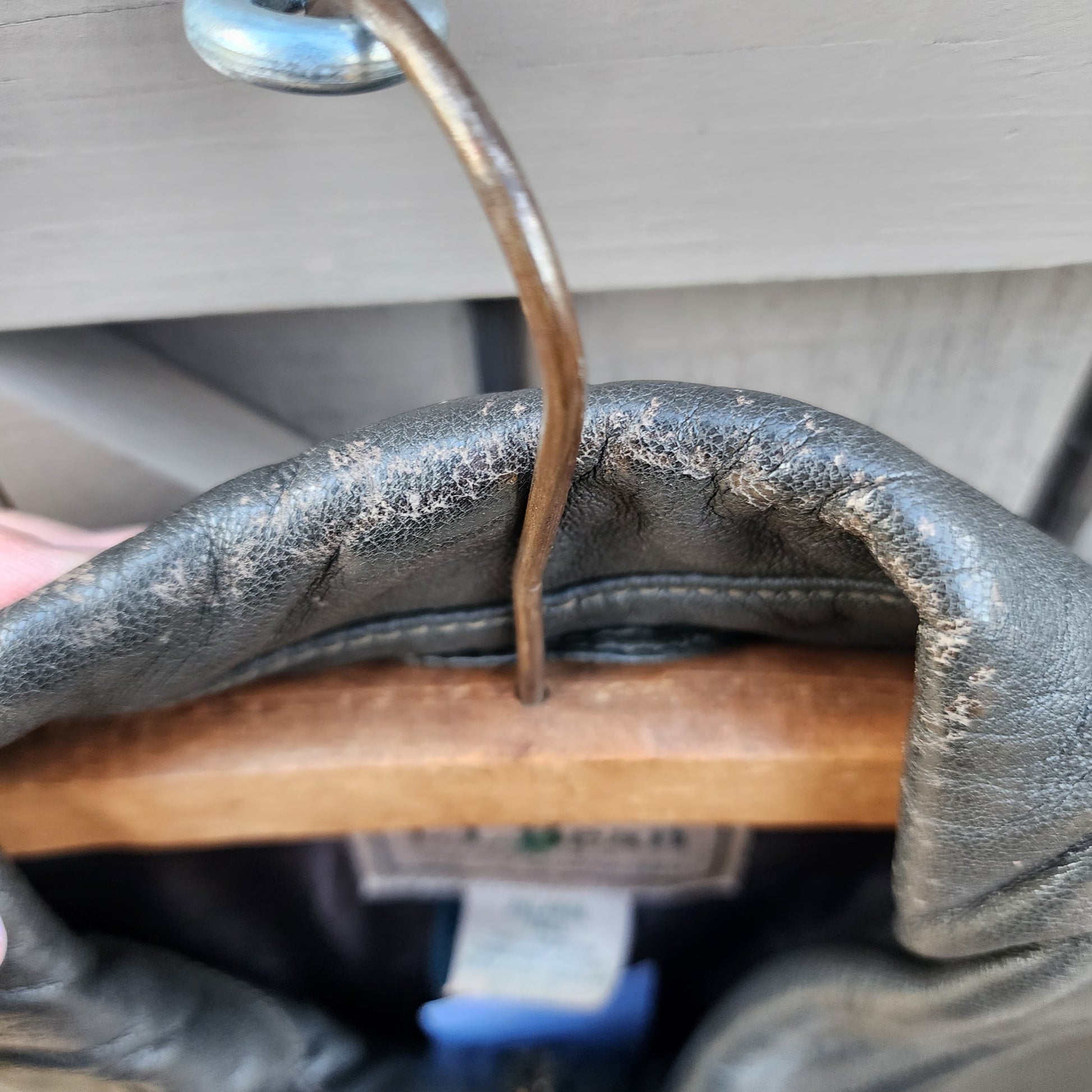 Please see pictures showing scuffs, scratches, buffs, inner wear (few tears in fabric) and outer wear. There are flaws, but it's vintage leather, so this is a common occurrence. There are pills on sleeve cuffs and the band across the bottom. Please observe flaws carefully.