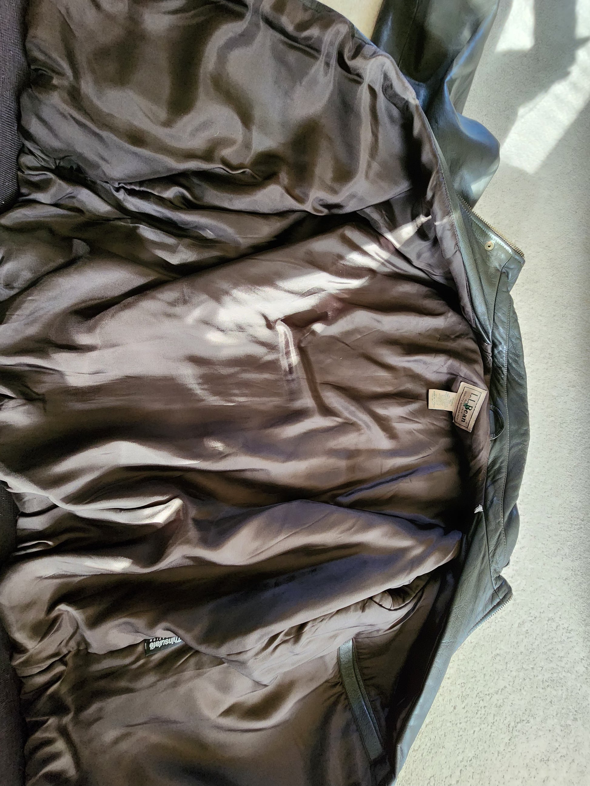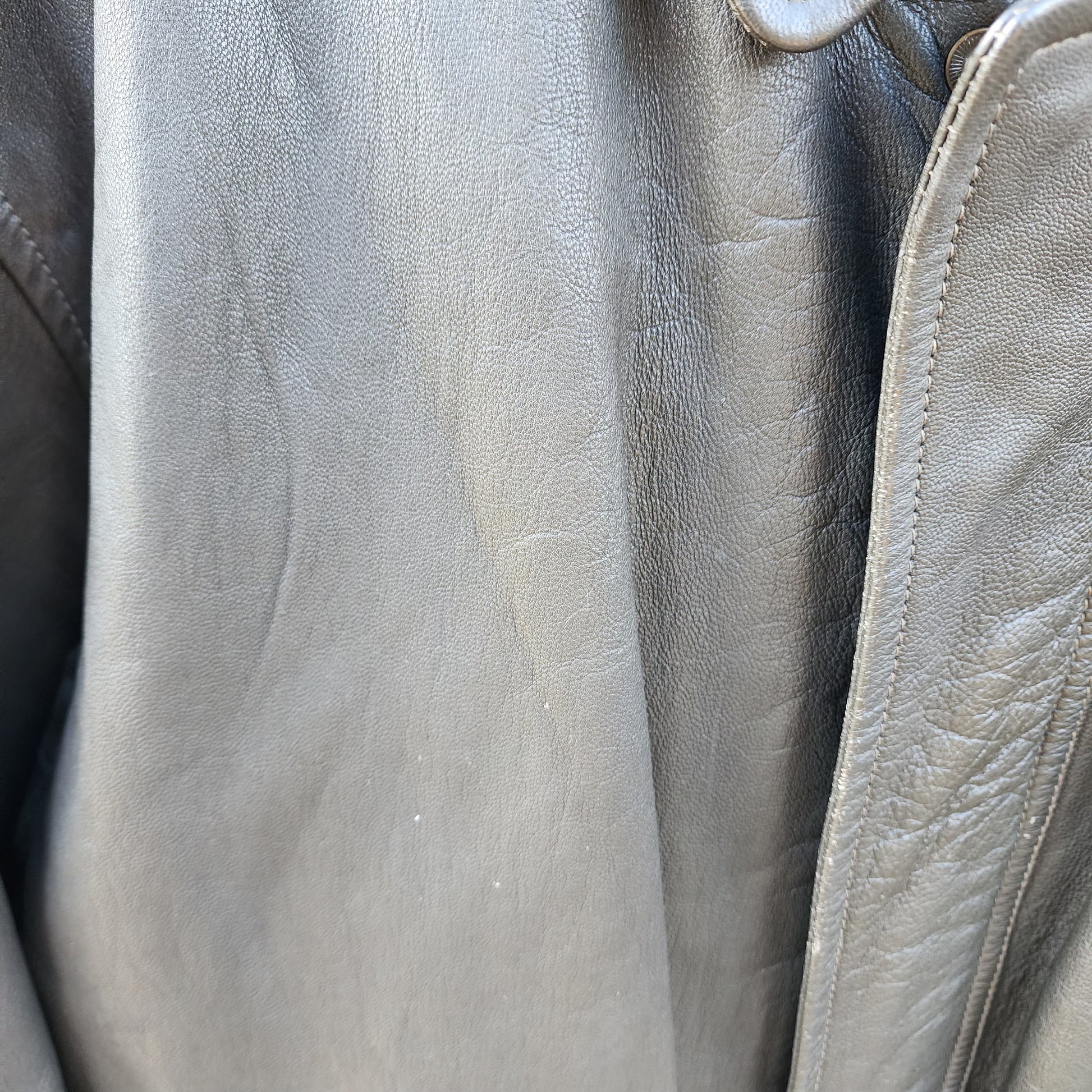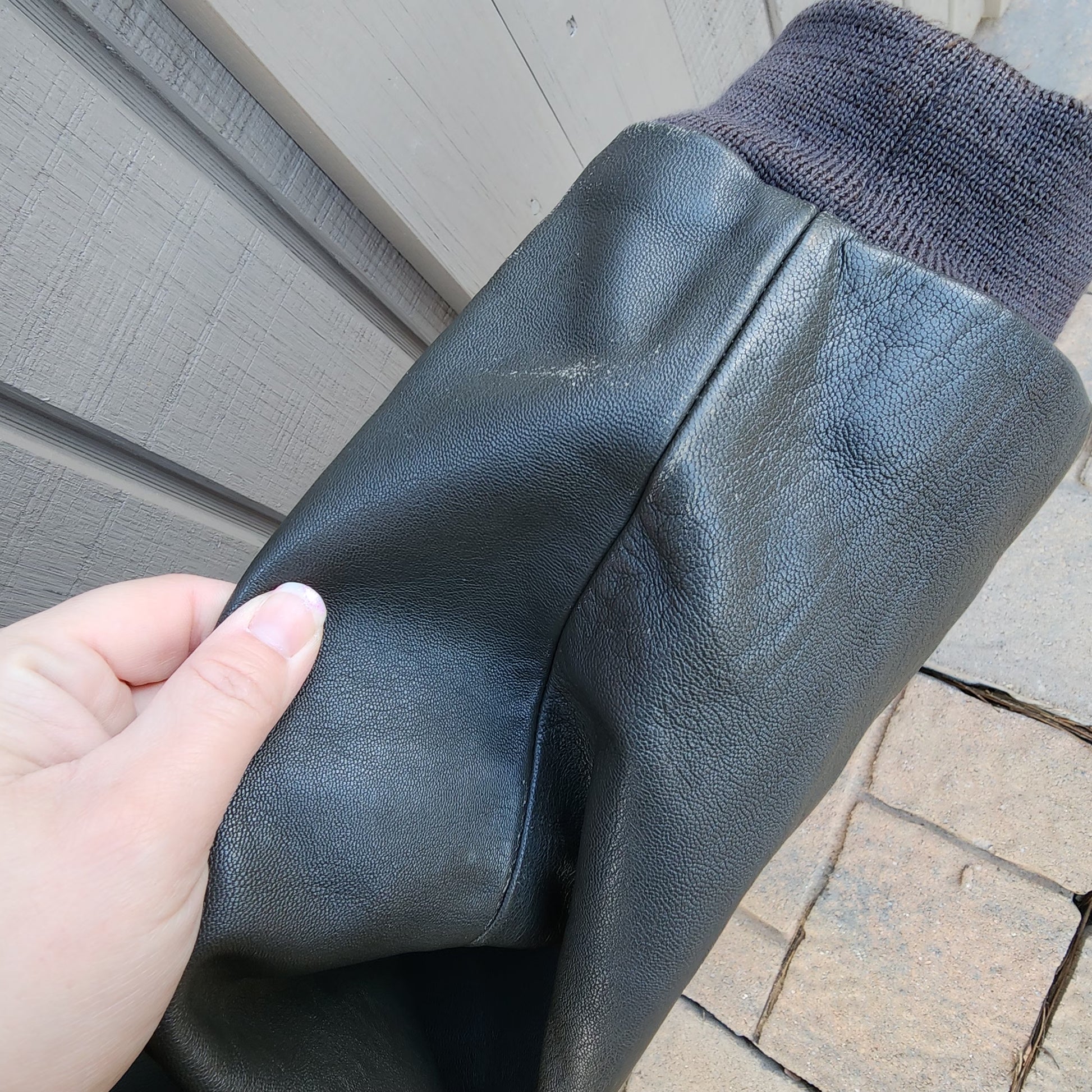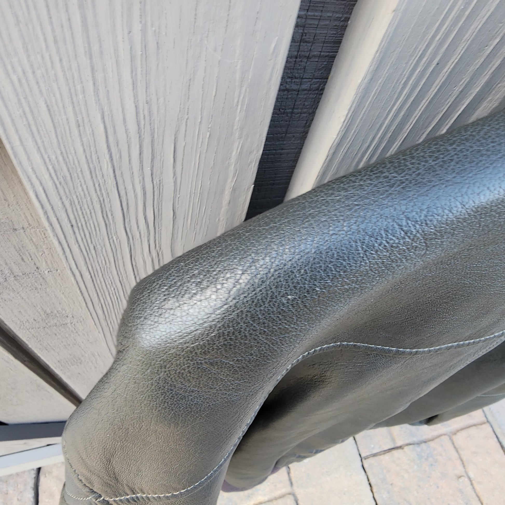 Please see pictures showing scuffs, scratches, buffs, inner wear (few tears in fabric) and outer wear. There are flaws, but it's vintage leather, so this is a common occurrence. There are pills on sleeve cuffs and the band across the bottom. Please observe flaws carefully.